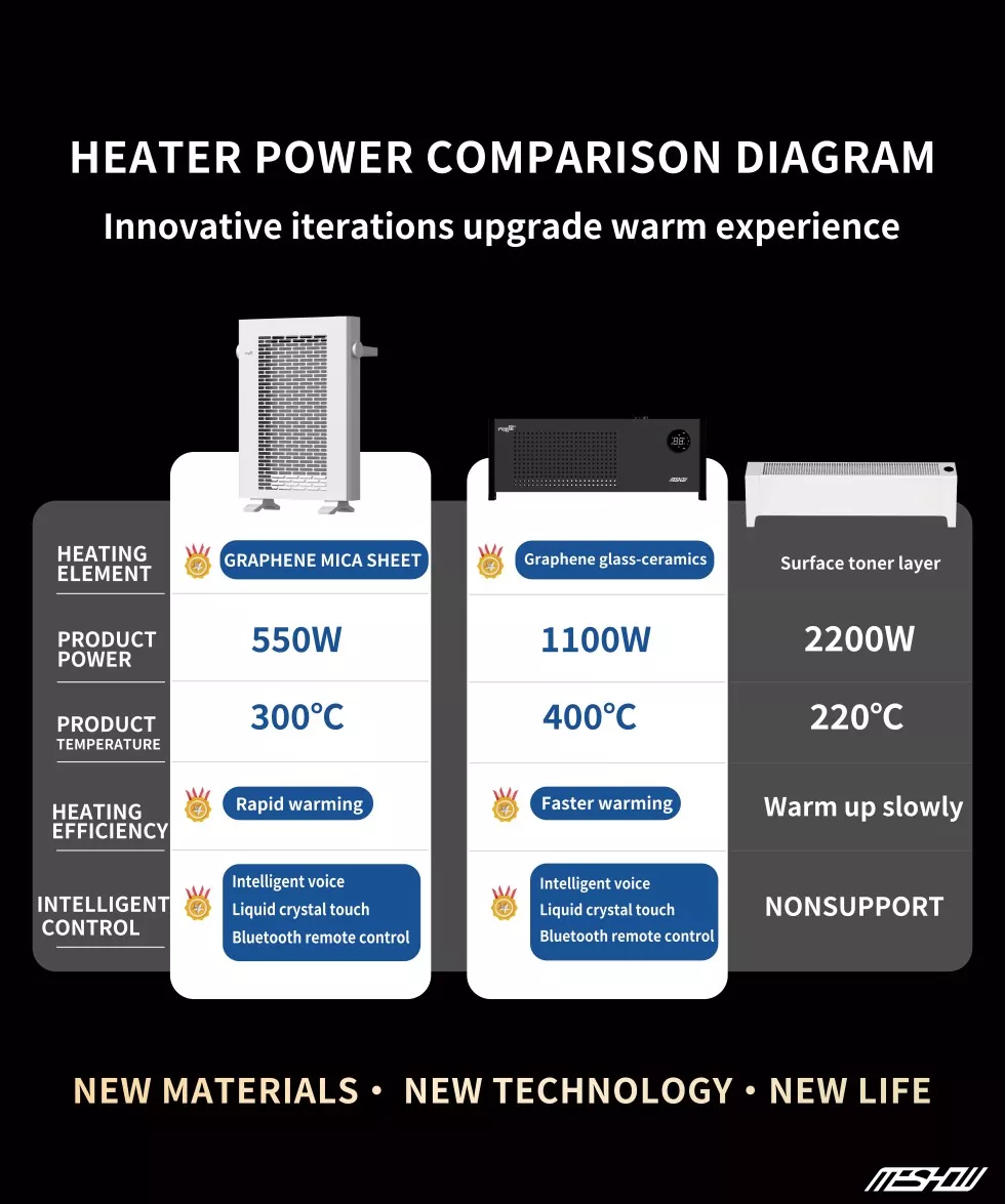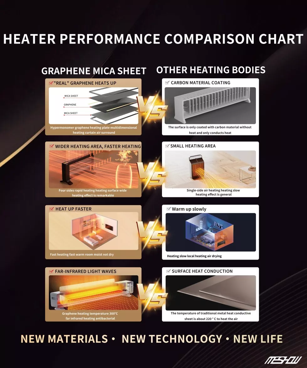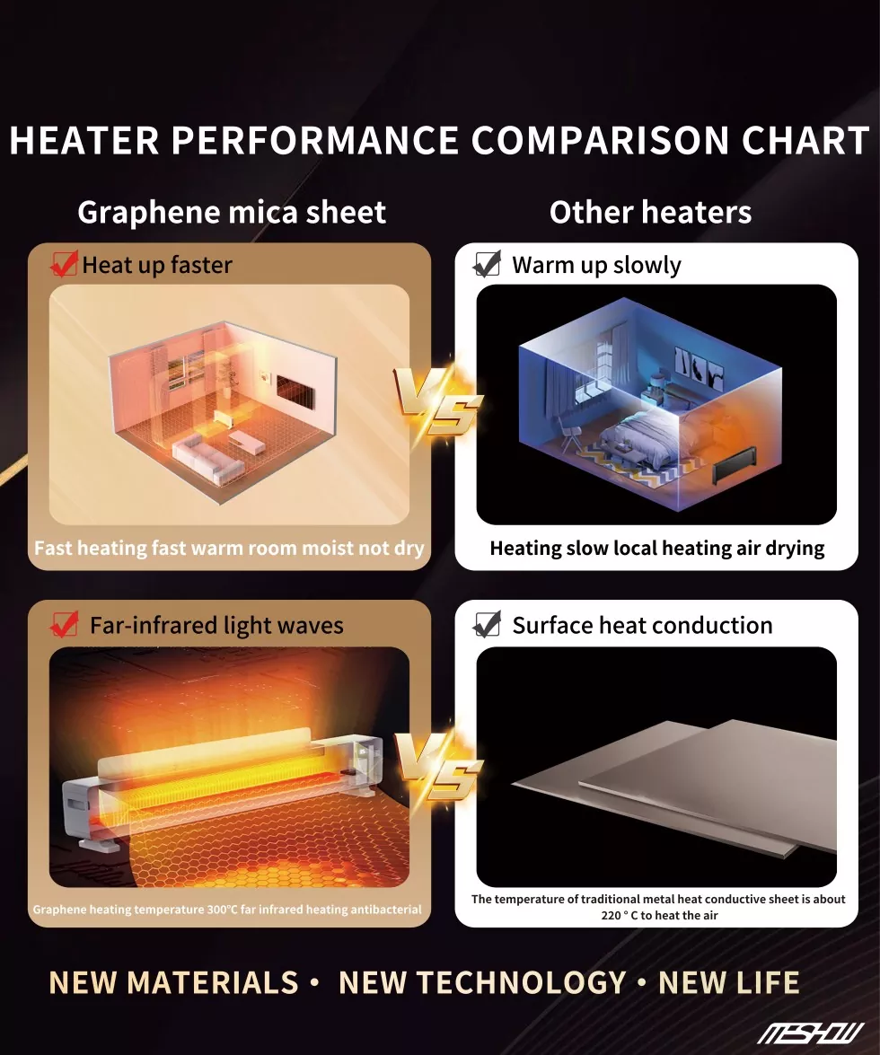 Meshow favorise les radiateurs verticaux de graphène blanc de haute qualité 1800W sur les marchés nationaux et internationaux. Avec la technologie de chauffage du graphène et une économie à haute efficacité et à l'énergie, il est très favorisé par les utilisateurs de la maison et du bureau et est devenu l'équipement de chauffage préféré. Le radiateur est fait de matériau de graphène, qui atteint une conversion à grande vitesse de l'énergie électrique en énergie thermique avec une conductivité thermique ultra-élevée, entraînant un chauffage rapide et uniforme. Son mode efficace crée d'excellents effets d'économie d'énergie, particulièrement adaptés aux saisons d'hiver froides, offrant une chaleur continue.